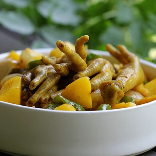 原料:凤爪、土豆、洋葱、青椒、红咖喱、干红椒、花椒、姜、油盐。