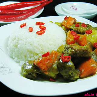 原料:米饭、排骨、土豆、胡萝卜、红椒、咖喱块、姜、料酒、老抽。