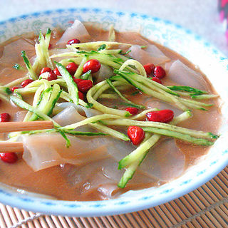 原料:粉皮、黄瓜、炸花生米、芝麻酱、盐、味精、白糖、生抽、醋、香油。