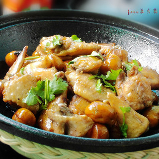 原料:板栗、鸡翅中、鸡翅尖、蒜、生姜、香菜、盐、鸡精、料酒、淀粉、白糖、油。