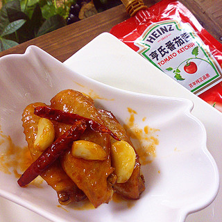原料:鸡中翅、葱、姜、干辣椒、黑椒粒、蒜头、桂皮、亨氏番茄酱、麻油、酱油、冰糖、酒。