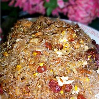 原料:米粉、腊肠、鸡蛋、蒜米、小葱、包菜、鸡精粉、黑胡椒粉、老抽。