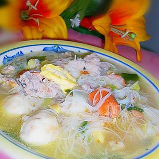 原料:米粉、鱼圆、蟹柳、香肠、肉末、葱 蒜 姜、蒜苗。