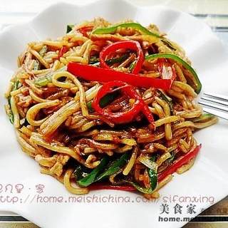 原料:肉丝、江西米粉、盐、淀粉、蒜、葱丝、青辣椒丝、红辣椒丝、老抽。