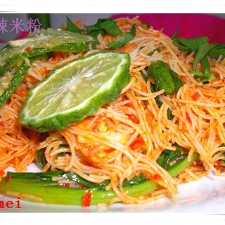 原料:泰国米粉、青菜、葱、蒜、肉片、自制辣椒糊、指天椒。