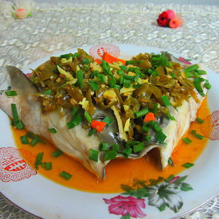 原料:鱼头、酸辣椒、姜片、姜丝。