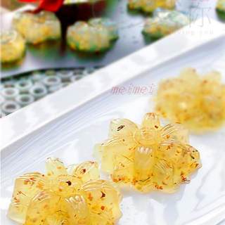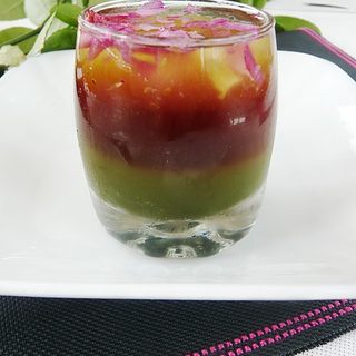 原料:果冻粉、绿茶粉、普洱茶、玫瑰花茶、水。