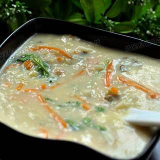 原料:小米、面条、黄豆、芹菜叶、胡萝卜、香菜、葱蒜、盐、胡椒粉、鸡精。
