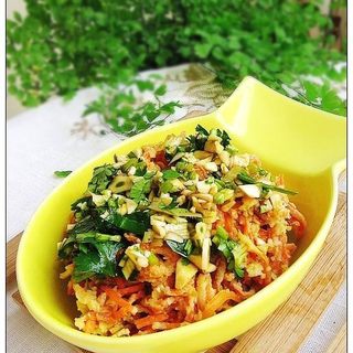 原料:胡萝卜、面粉、蒜、醋、味极鲜、自制虾油、香菜末。
