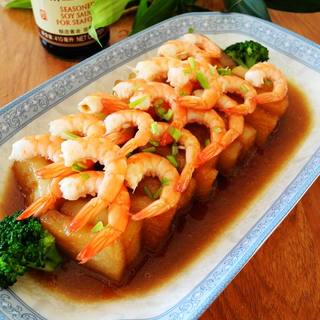 原料:冬瓜、对虾、西兰花、高汤、花生油、李锦记蒸鱼豉油、美极鲜。