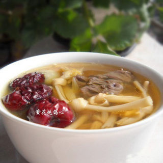 原料:干黄花菜、鸽心、红枣、生姜、香油、胡椒、淀粉、盐、味精。
