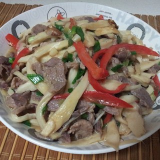 原料:杏鲍菇、猪肉、沙姜、葱、红甜椒、料酒、盐、油、鲍鱼汁、淀粉、酱油。
