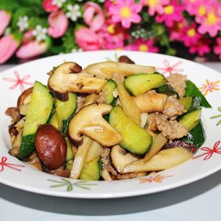 原料:牛蒡、香菇、青瓜、肉末、姜、蒜、油、盐、生抽、糖。