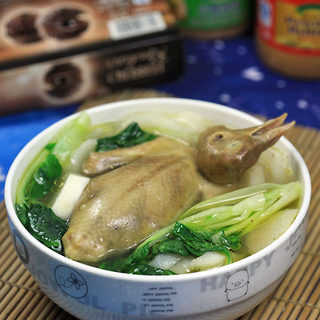 原料:中鸽、山药、姜、白菜苗、盐、鸡精。
