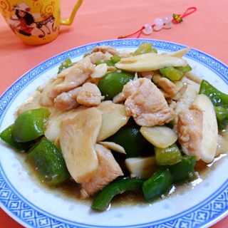 原料:鸡胸肉、茭白、甜椒、食用油、淀粉、姜片、蒜片、蚝油、盐、鸡精、白糖。