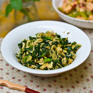 原料:芹菜叶、虾皮、鸡蛋、葱、盐、生抽、糖、胡椒粉。