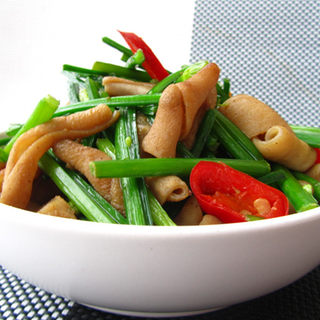原料:鸭肠、韭菜花、红辣椒、姜、花椒、干辣椒、大葱、料酒、酱油、食用碱。