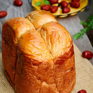 原料:高筋面粉、奶粉、清水、蛋液、黑糖、盐、酵母、黄油、枣肉碎、全蛋液。