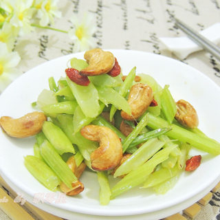 原料:芹菜、腰果、枸杞、油、盐、生姜、鸡精、淀粉。