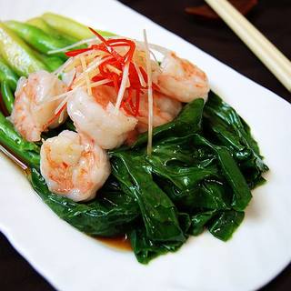 原料:芥蓝、鲜虾、红彩椒、葱丝、姜丝、食用油、酱油、白糖、盐、胡椒粉、香油。