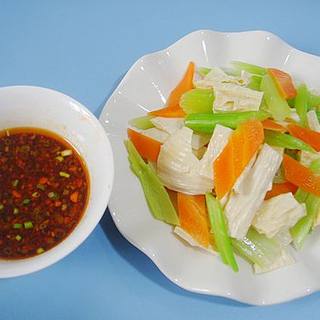 原料:腐竹、西芹、胡萝卜、蒜、葱、盐、香油、香辣王、生抽、醋、鸡粉。
