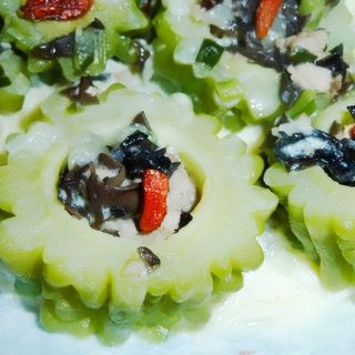 原料:苦瓜、木耳、肉末、葱、枸杞、盐、水淀粉。