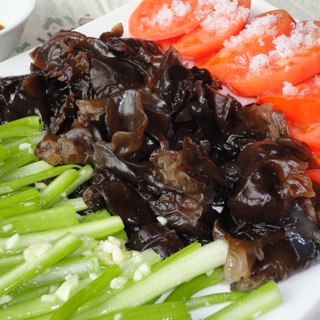 原料:西红柿、黑木耳、西芹、大蒜、芥末、精盐、鸡精、白糖、白醋、生抽、老醋。
