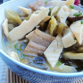 原料:笋、芦溪酸菜、泡椒、猪肉、姜、蒜头、泡椒水、咸菜水、盐、鸡精、葱末。