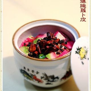 原料:心里美萝卜皮、盐、小干辣椒、花椒粒。