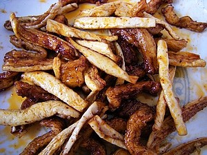 原料:萝卜、老抽、五香粉、盐、辣椒油。
