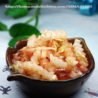 原料:白萝卜、韩式辣椒粉、白醋、糖、盐、鱼露、蒜、葱、姜。