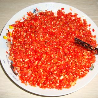 原料:小辣椒、蒜头、油、盐。
