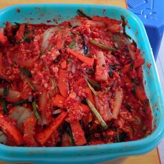原料:大白菜、白萝卜、胡萝卜、苹果、鸭梨、葱、韭菜、洋葱、虾仁、大蒜、老姜、辣椒粉。