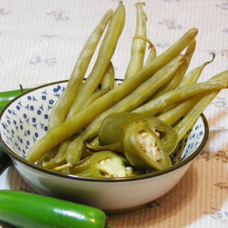原料:四季豆、新鲜辣椒、花椒皮、茴香籽、蒜头、海盐、高度酒、水。