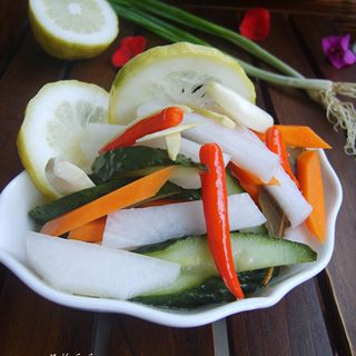 原料:白萝卜、红罗卜、黄瓜、柠檬、姜、蒜、小尖椒、香叶、白糖、白醋、盐、清水。