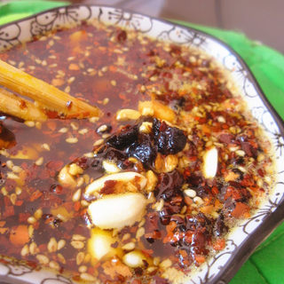 原料:干红辣椒、花椒、豆豉、香叶、陈皮、桂皮、植物油、八角、花生、芝麻。