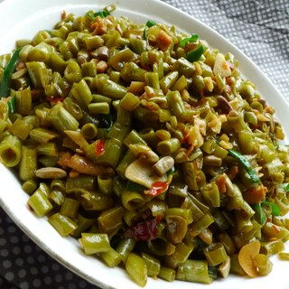 原料:酸豆角、猪里脊肉、葱末、姜末、蒜末。