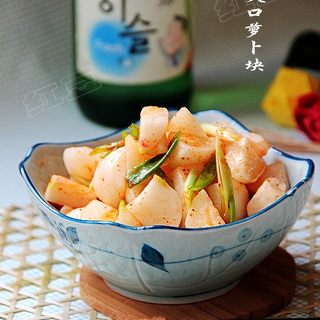 原料:水萝卜、小葱、盐、韩式糖稀、韩式辣酱、苹果醋、辣椒粉、香油。