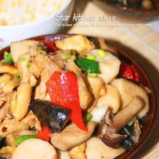 原料:鸡腿肉、鸡腿菇、茶树菇、杏鲍菇、香菇、大红辣椒、小葱、生粉、料酒、羊奶酒、酱油、白糖、咸盐、白胡椒、鸡精。