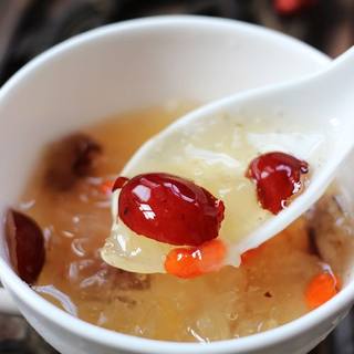 原料:银耳、皂角米、去核红枣、枸杞、冰糖。