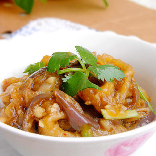 原料:茄子、香菜、大蒜、生姜、食盐、蚝油、生抽、辣椒粉、香油、鸡精。