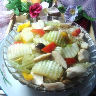 原料:莴苣、杏鲍菇、红甜椒、黄甜椒、葱、油、蚝油、盐、水淀粉、香油。