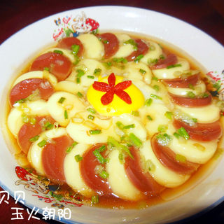 原料:玉子豆腐、圆中火腿、鸡蛋、葱、香菜、枸杞子。