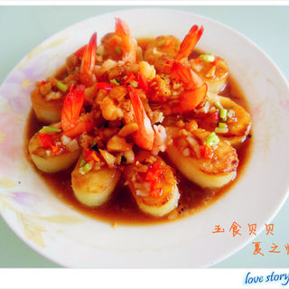 原料:冬瓜、鲜活虾、葱、姜、高汤、料酒、蒸鱼豉油、天成一味鲜酱油。