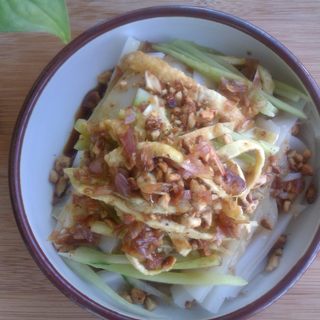原料:面粉、黄瓜、花生、红葱头、醋、生抽、鸡精、盐。