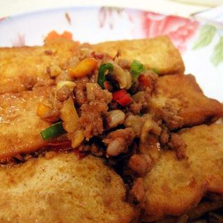 原料:北豆腐、猪肉末、蒜瓣、大葱、郫县豆瓣酱、红油花生、糖、生抽。