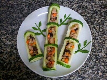 原料:黄瓜、鸡腿、香菇、胡萝卜、盐、胡椒、料酒。