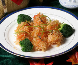 原料:水发干贝、大虾肉、肥猪肉、净冬笋、菠菜心、精盐、味精、绍酒、葱姜汁、鸡蛋清、芝麻油、湿淀粉。