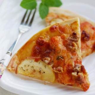 原料:鸡胸肉、核桃仁、小苹果、高粉、低粉、细盐、酵母、温水、橄榄油、奥尔良烤肉料、番茄酱、马苏、披萨草。