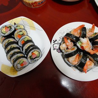 原料:大米、糯米、黄瓜、红罗卜、鸡蛋、肉松、虾仁、火腿、醋、盐。
